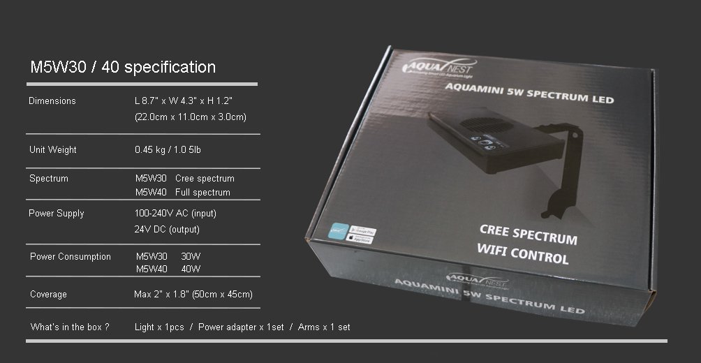 Aquanest m5w 40 light The Aquanest M5W 40 Light is a 40-watt LED aquarium light intended mainly for reef and marine tanks but can also be used in freshwater setups that need strong lighting. It’s part of Aquanest’s AQUA MINI LED series, offering efficient, broad-angle illumination.